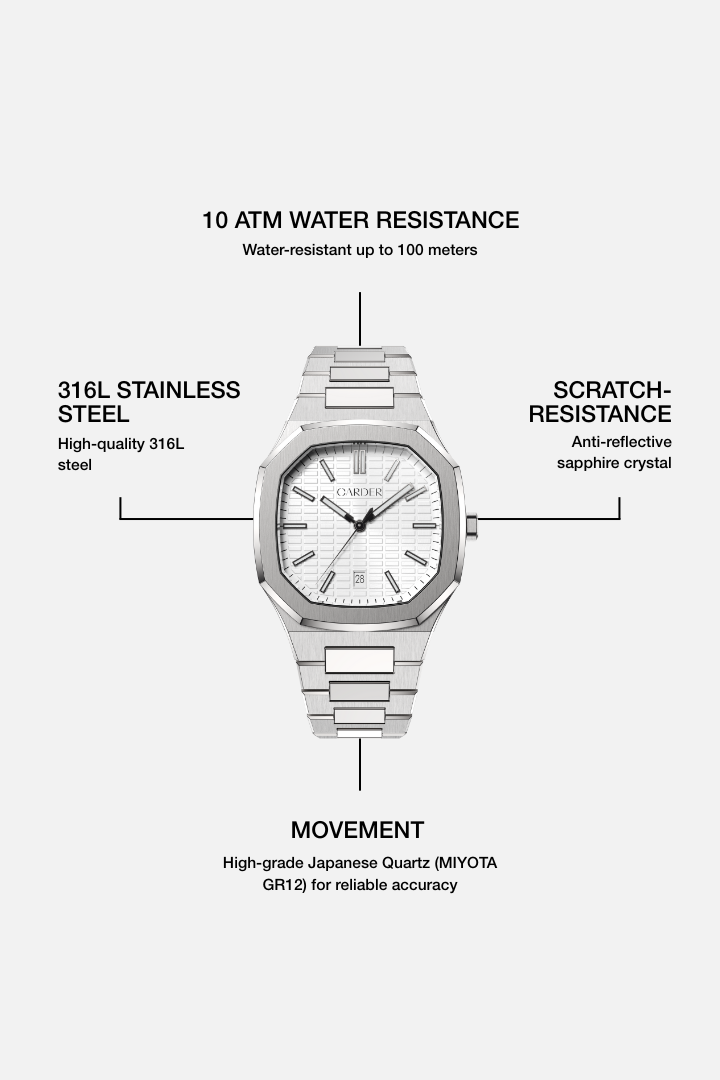 Movement - Quartz (MIYOTA GR12) - Battery-powered for precise and reliable timekeeping. Easy to maintain.